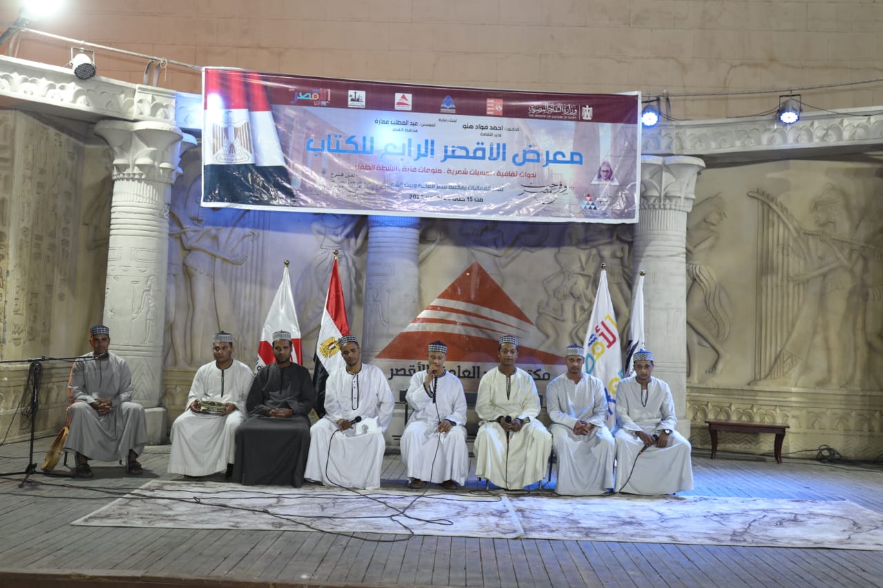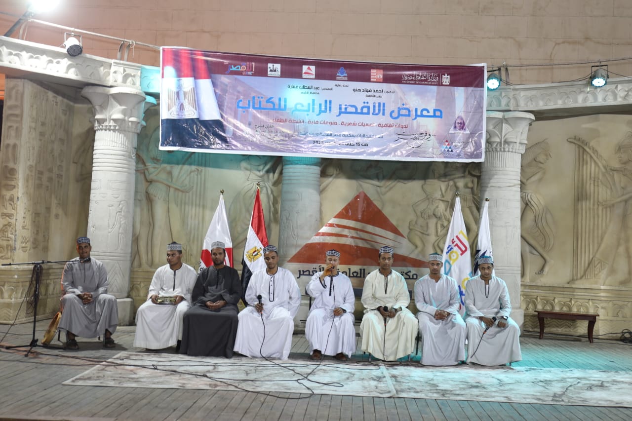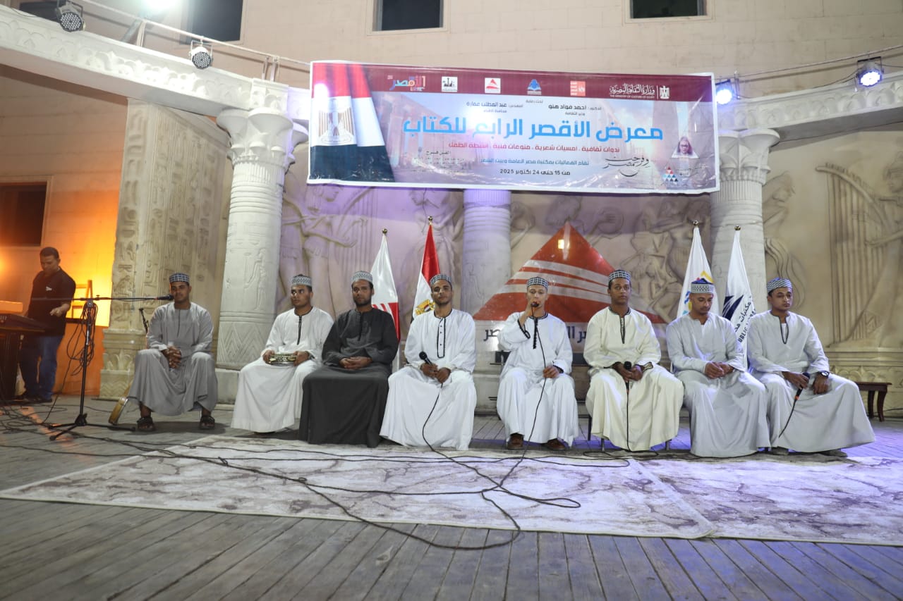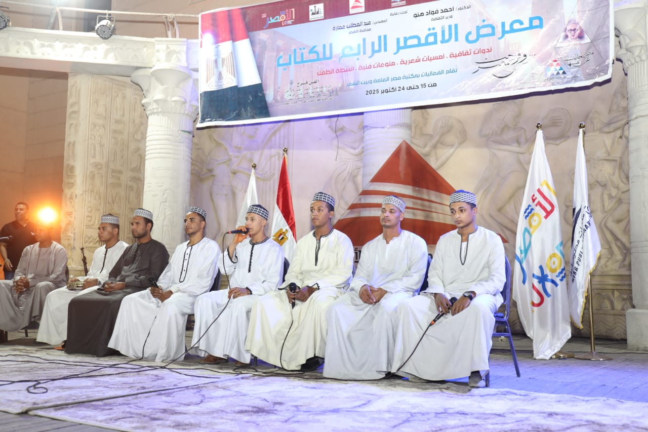 وقدمت الفرقة باقة من الأناشيد والابتهالات الروحية التي أضفت أجواءً من الصفاء والسكينة، منها: «يا حبيب سلام عليك»، «رسول الله زادي»، «وهذه ليلة مباركة»، وغيرها من الإنشادات التي تفاعل معها الجمهور بالتصفيق والإنشاد، في ختام يوم احتفى بالكلمة والروح والفن معًا، في أجواء من البهجة والإبداع داخل معرض الأقصر الرابع للكتاب.