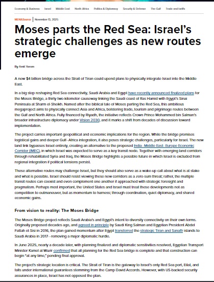 وإلى جانب الممرات البرية الناشئة عبر سوريا والعراق بعد إعادة تأهيلهما، يُسلط جسر موسى الضوء على مستقبل محتمل تُستبعد فيه إسرائيل من التكامل الإقليمي في حال استمرار التوترات السياسية. حسب تقرير مطول لموقع Atlantic Council وهو مركز أبحاث (Think Tank) مقره واشنطن، تأسس عام 1961 ويُعد من المراكز المؤثرة في مجالات: السياسات الدولية، والعلاقات الأمريكية – الأوروبية، وقضايا الطاقة والاقتصاد، والأمن الإقليمي بما في ذلك الشرق الأوسط، وهو ليس موقعًا إخباريًا تقليديًا، بل منصة تحليلية تنشر تقارير ودراسات للباحثين والمتخصصين. ويُعتبر من المؤسسات ذات السمعة الجيدة في مجال التحليل السياسي والاستراتيجي.