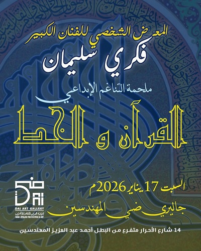 ويقدم الفنان فكري سليمان من خلال معرضه «الخط القرآن» ملحمة التناغم الإبداعي ، مجموعة من لوحات الخط العربي التي تعتمد على التوازن بين الحرف والتكوين واللون، حيث يسعى الفنان إلى إبراز جماليات الحرف العربي بوصفه عنصرًا بصريًا قادرًا على التعبير الفني، من خلال صياغات معاصرة تحافظ على أصالة الخط وروحه الجمالية.