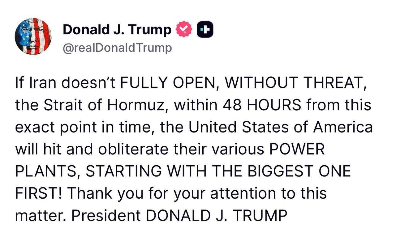 هدد الرئيس الأمريكي دونالد ترامب بتوجيه ضربة قاسية للبنية التحتية ومحطات الطاقة المختلفة في إيران، خلال 48 ساعة إذا لم تقم بفتح مضيق هرمز بشكل كامل ودون أي تهديد، لافتاً إلى أن الضربة ستبدأ بأكبر محة نفط داخلها.