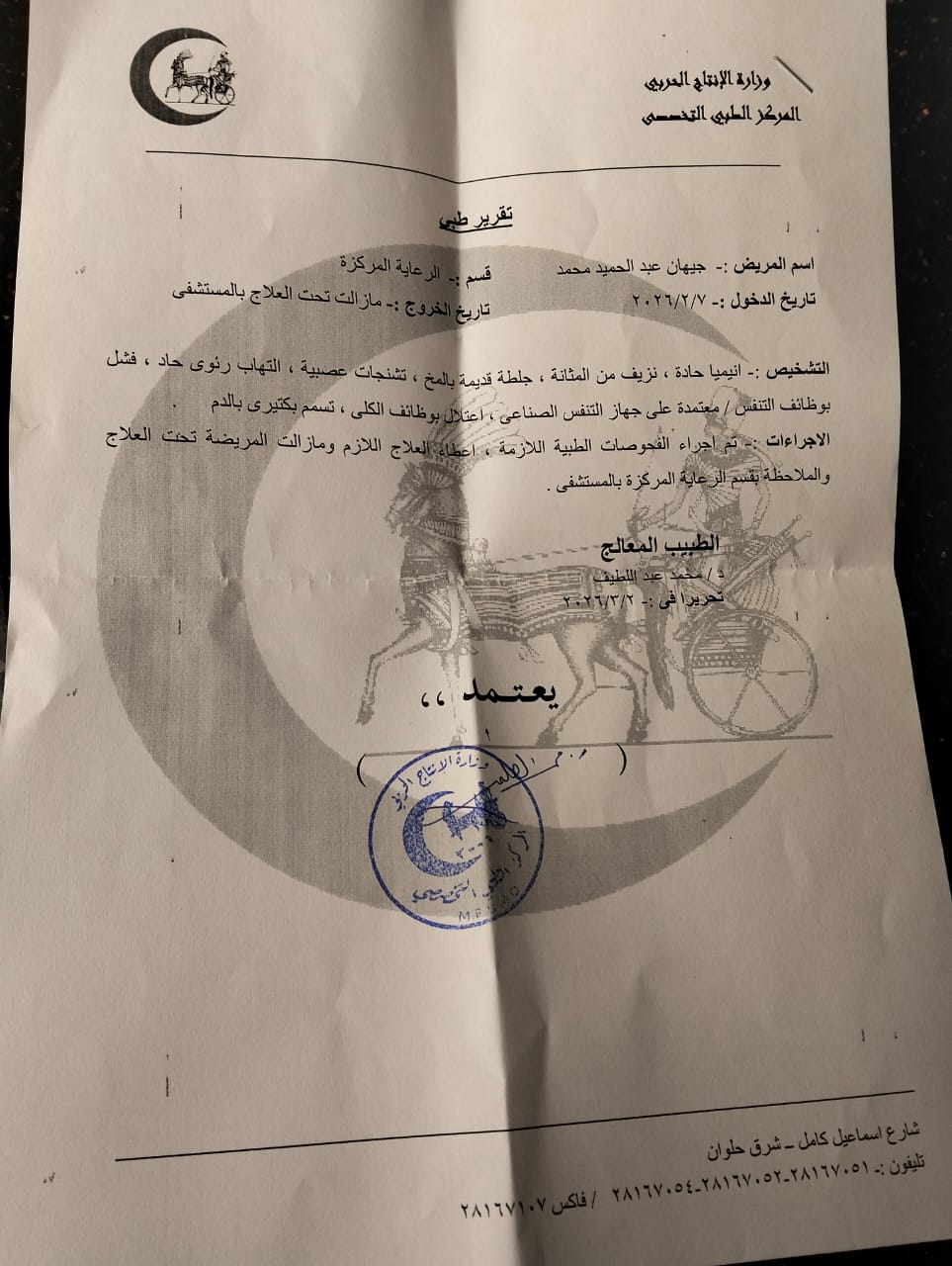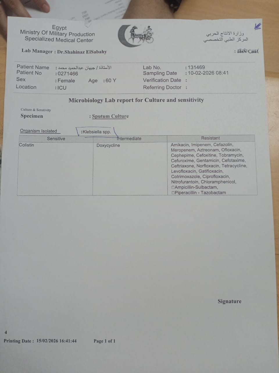 داخل العناية المركزة.. استمرت الحالة لمدة 47 يوما خضعت خلالها المريضة لمحاولات علاج مكثفة شملت تغيير أنواع متعددة من المضادات الحيوية ومتابعة دقيقة على مدار الساعة.