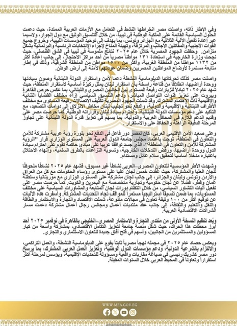 في إطار توجيهات رئيس الجمهورية، وانطلاقًا من الثوابت الحاكمة للسياسة الخارجية المصرية، واصلت مصر خلال عام 2025 اضطلاعها بدور فاعل ومسئول داخل محيطها العربي، بما يعكس مكانة مصر كركيزة للاستقرار الإقليمي وارتباطها الحيوي بقضايا الأمة العربية، ودعم مسارات التعاون والتكامل والتنمية، وصون الأمن القومي العربي في ظل بيئة إقليمية شديدة التعقيد.