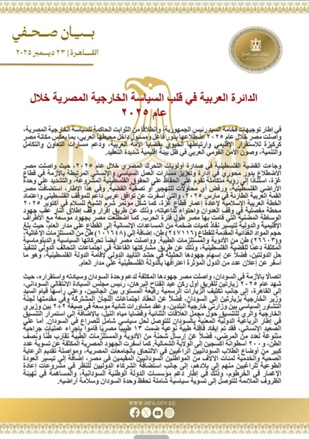 ويعكس حصاد عام 2025 في مجمله نهجاً مصرياً ثابتاً يقوم على الدبلوماسية النشطة، والعمل التراكمي، والالتزام بالشرعية الدولية، ودعم مؤسسات الدول الوطنية، وتعزيز العمل العربي المشترك، بما يرسخ دور مصر كشريك رئيسي في صياغة مقاربات واقعية ومسؤولة للتحديات الإقليمية، ويؤسس لمرحلة أكثر استقراراً وتعاوناً في المحيط العربي خلال السنوات المقبلة.