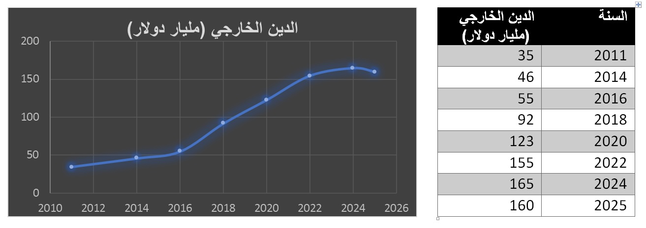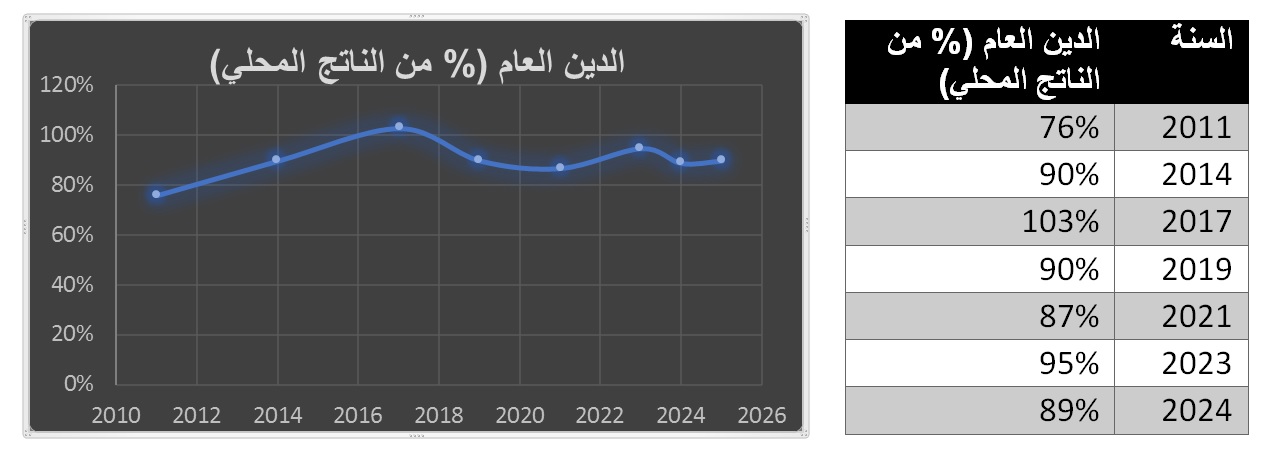 يوضح الجدول والرسم البياني التالي المسار العام لتطور الدين الحكومي (محلي + خارجي) كنسبة تقريبية من الناتج المحلي الإجمالي، استنادًا إلى بيانات حكومية وتقارير مؤسسات مالية دولية: