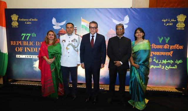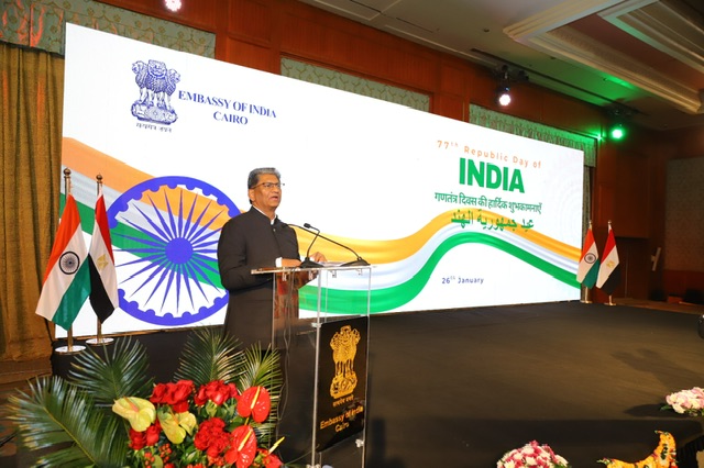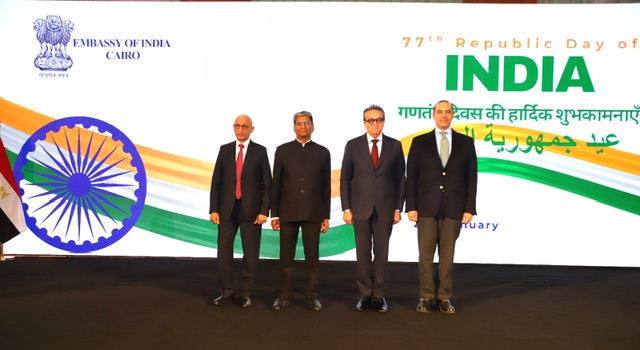 ورحّب السفير خلال حفل الاستقبال الذي أقامته السفارة بمناسبة الاحتفال بعيد جمهورية الهند لعام 2026، بالحضور من الوزراء وكبار المسؤولين المصريين، يتقدمهم الدكتور خالد عبد الغفار نائب رئيس الوزراء ووزير الصحة والسكان، والدكتور شريف فاروق وزير التموين والتجارة الداخلية، وعلاء فاروق وزير الزراعة واستصلاح الأراضي، والدكتور محمود عصمت وزير الكهرباء والطاقة المتجددة، إلى جانب السادة أبناء الجالية الهندية والأصدقاء، مؤكدًا أن هذه المناسبة تمثل لحظة فخر واعتزاز بدخول الهند عامها السابع والسبعين كجمهورية.