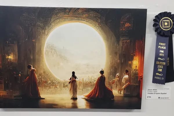 تجربة "جيسون ألين" ولوحة "مسرح أوبرا الفضاء". في عام 2022، فاز "جيسون ألين" بالمركز الأول في مسابقة فنية بولاية كولورادو الأمريكية عن لوحة أنتجها باستخدام برنامج الذكاء الاصطناعي . هنا انفجر الجدل حول الانبهار بـ "النتيجة" لا "الفعل": الجمهور ولجنة التحكيم انبهروا بدقة التفاصيل، الإضاءة الدرامية، والتكوين الكلاسيكي المذهل. هذا هو "الإبهار البصري" الذي تحدثنا عنه. لكن عندما كشف أن الفنان لم يمسك ريشة، بل كتب "نصاً" للآلة، شعر الكثيرون بالخديعة. وبدأ التساؤل هل هو "مبدع" أم "مستفيد من التقنية"؟